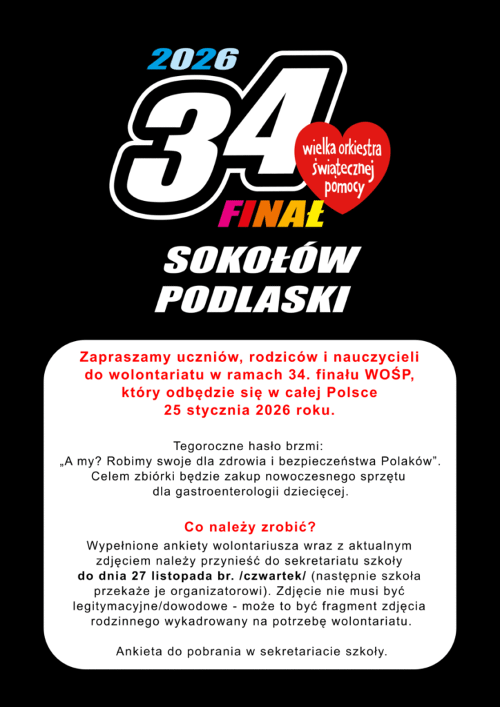 Sztab Wielkiej Orkiestry Świątecznej Pomocy w Sokołowie Podlaskim zaprasza naszą społeczność do wolontariatu w ramach 34. finału WOŚP.