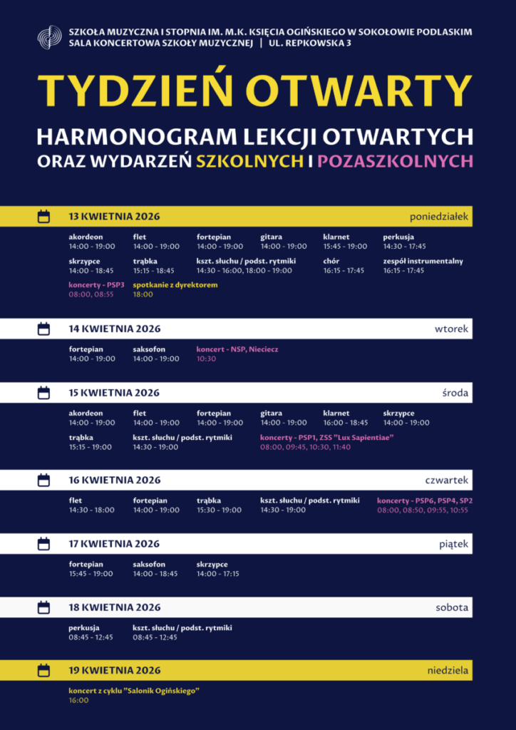 W godzinach porannych odwiedzać będziemy szkoły podstawowe, w których, podczas koncertów, nasi uczniowie zaprezentują instrumenty. W godzinach popołudniowych zapraszamy do naszej szkoły, aby przyjrzeć się z bliska zajęciom prowadzonym w naszej szkole.